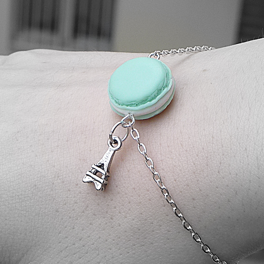 náramek s makronkou z polymerové hmoty s kovovým přívěskem- Eiffelovkou, délka 18,5cm (mohu upravit)