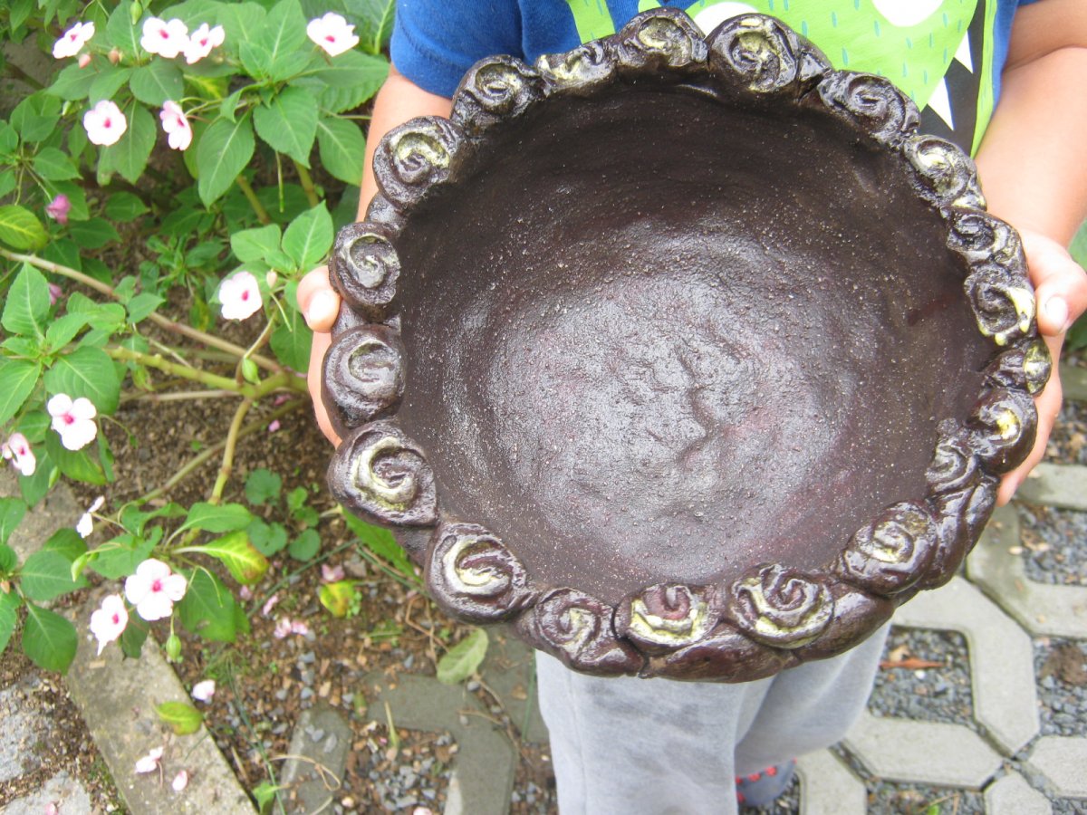 ručně modelovaná mísa, okraje opatřeny spirálkami se žlutozelenými efekty, výška 10cm šířka 20cm, originální