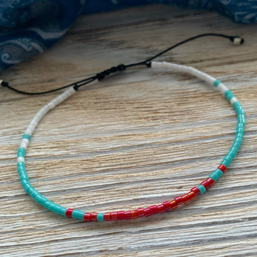 Náramek z luxusních drobných japonských skleněných korálků Miyuki na černé syntetické šňůrce. Délka korálkové části 15 cm. Univerzální velikost - náramek je nastavitelný díky posuvnému uzlíku