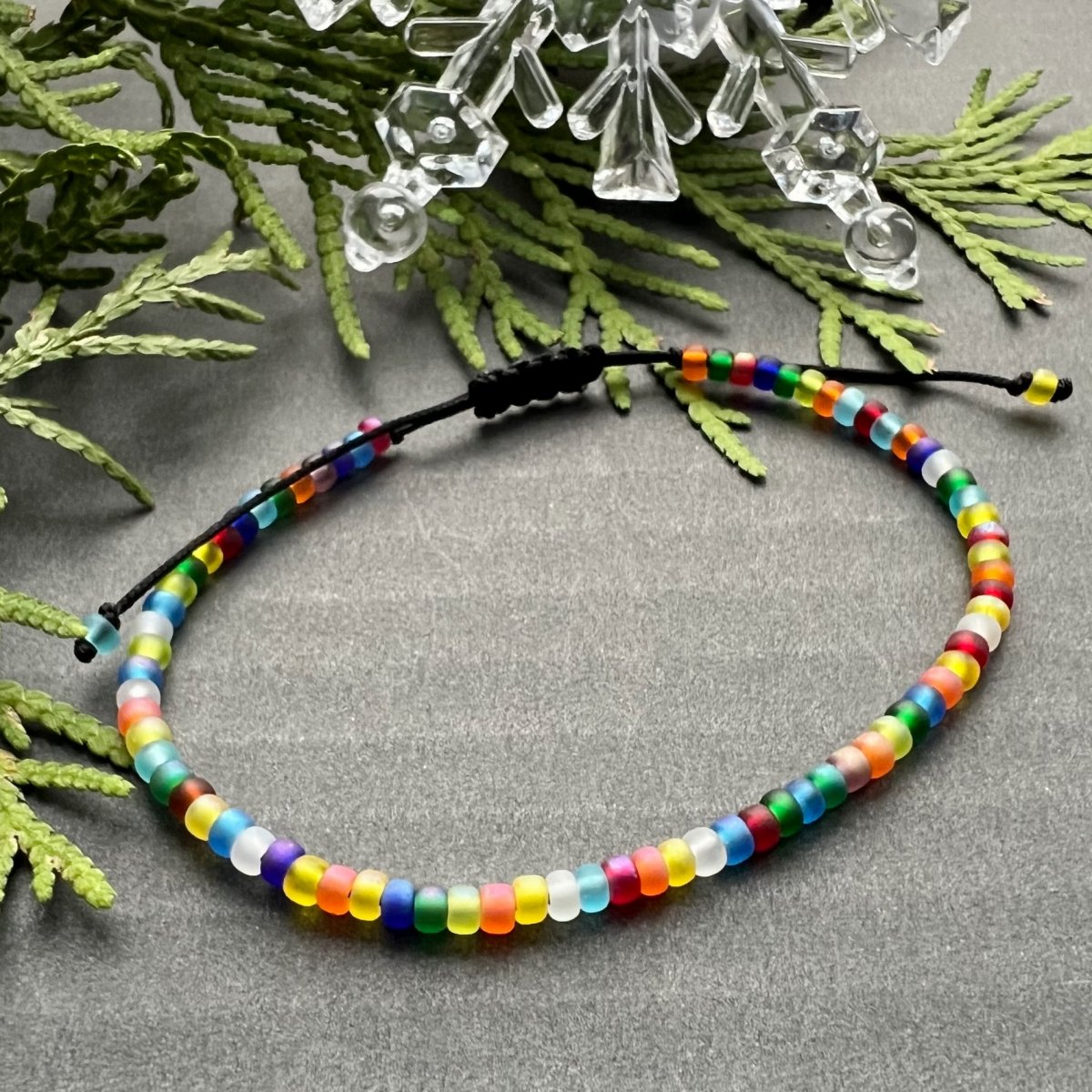 Náramek z luxusních drobných japonských matných skleněných korálků Miyuki round na černé syntetické šňůrce. Délka korálkové části 15 cm.Univerzální velikost - náramek je nastavitelný díky posuvnému uzlíku