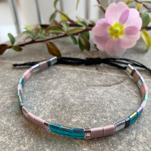 Náramek z luxusních japonských skleněných korálků Miyuki Tila (dvoudírkové korálky 5 x 5 mm) na černé bavlněné šňůrce. Délka korálkové části 15 cm. Univerzální velikost - náramek je nastavitelný díky posuvnému uzlíku