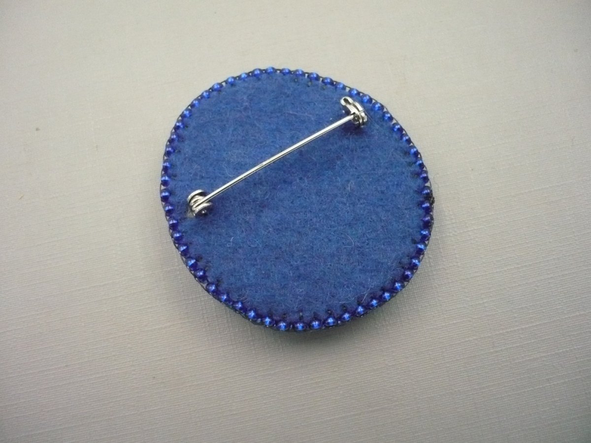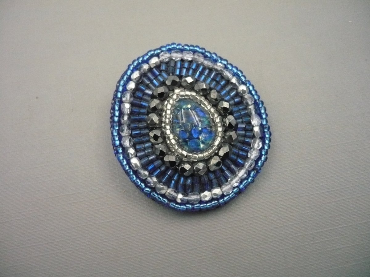 Ručně vyšívaná brož technikou beadweaving. Uprostřed brožky je skleěný kabošon obšitý rokajlem a stříbrnými ohňovkami, vše je podloženo modrou plstí, na zadní straně je brožový špendlík s pojistkou. Rozměry 48 x 43 mm.