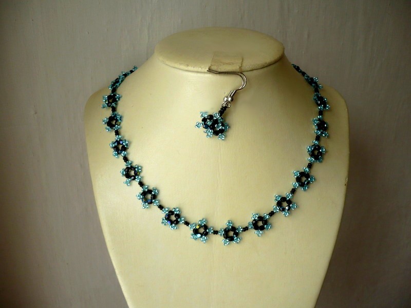 Ručně šitý náhrdelník a náušnice z rokajlových korálků a modročerných ohňovek. Vše je jablonecké sklo. Zapínání a afroháčky jsou z chirurgické oceli, jsou tedy hypoalergenní. Délka je 43 cm, délka náušnic 2 cm bez háčku.