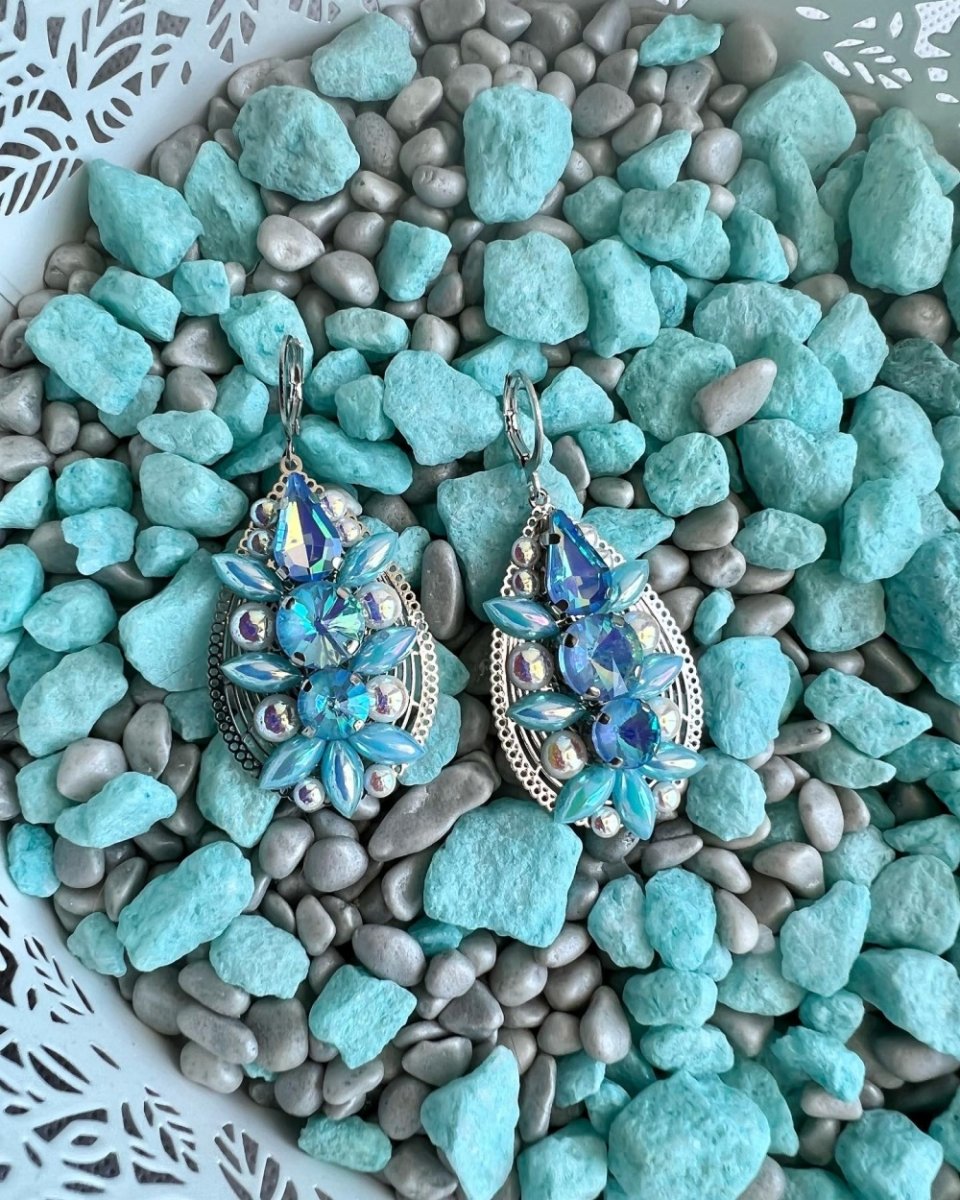 Nádherné ručně vyráběné náušnice s modrými a perleťovými kamínky.Velikost: 2,6 x 4,3 cm (+ zapínání)Tento druh náušniček dodávám v krabičce.