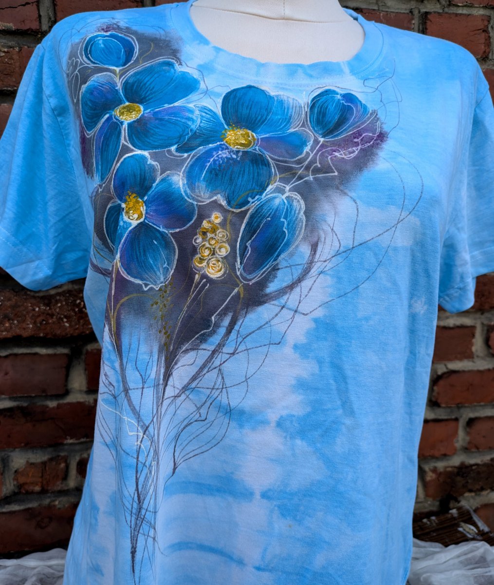 Dámské triko je ručně malované a batikované v příjemných odstínech modré s originálním motivem macešek.