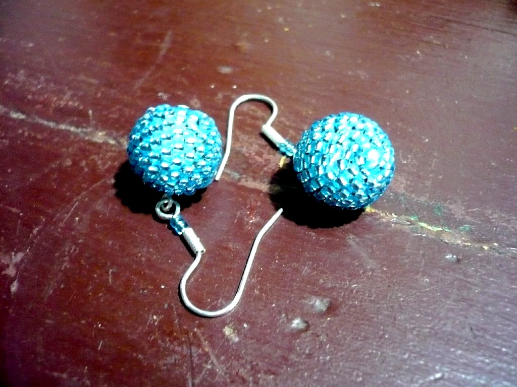 Ručně obšívaný dřevěný korálek rokajlovými korálky, zavěšeno na stříbrném afroháčku. Průměr 1.5 cm. Jsou akorát, upoutají pozornost hlavně svou barvou :)