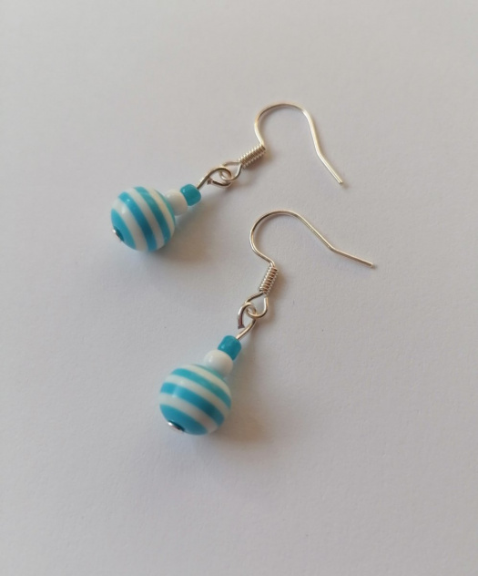 Náušnice z plastových korálků modré a bílé barvy se stříbrnými komponenty z běžného bižuterního kovu. Součástí náušnic jsou i silikonové zarážky. Délka náušnic je 17 mm bez afroháčku.
