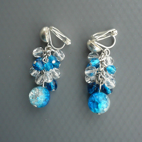 Náušnice jsou tvořeny z čirých a modrých broušených skleněných korálků a spodního modročirého skleněného korálku s vnitřní ozdobnou popraskanou strukturou.