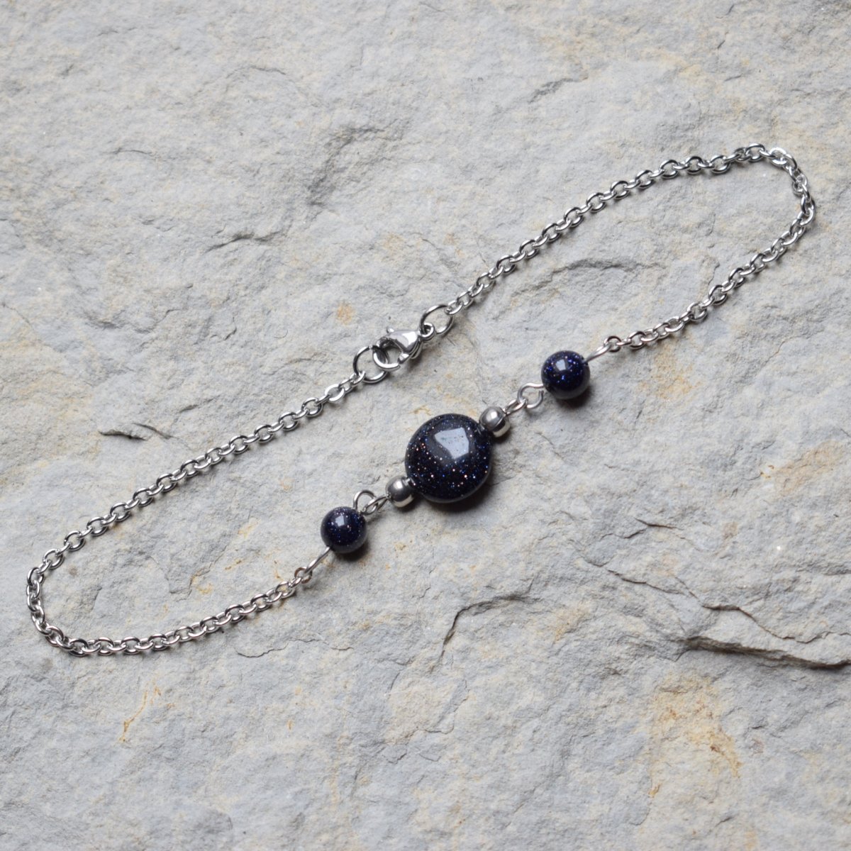 Nákotník je vyroben z komponentů z nerezové oceli a modrého avanturínu. Délka je cca 25 cm včetně zapínání na karabinku.