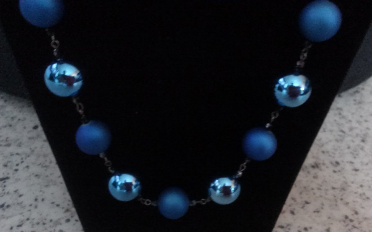 Modrý,dlouhý náhrdelník z vetšich skleněných korálků o velikosti 1,60cm.Délka 70cm s bižuternim zapínáním na karabinku.