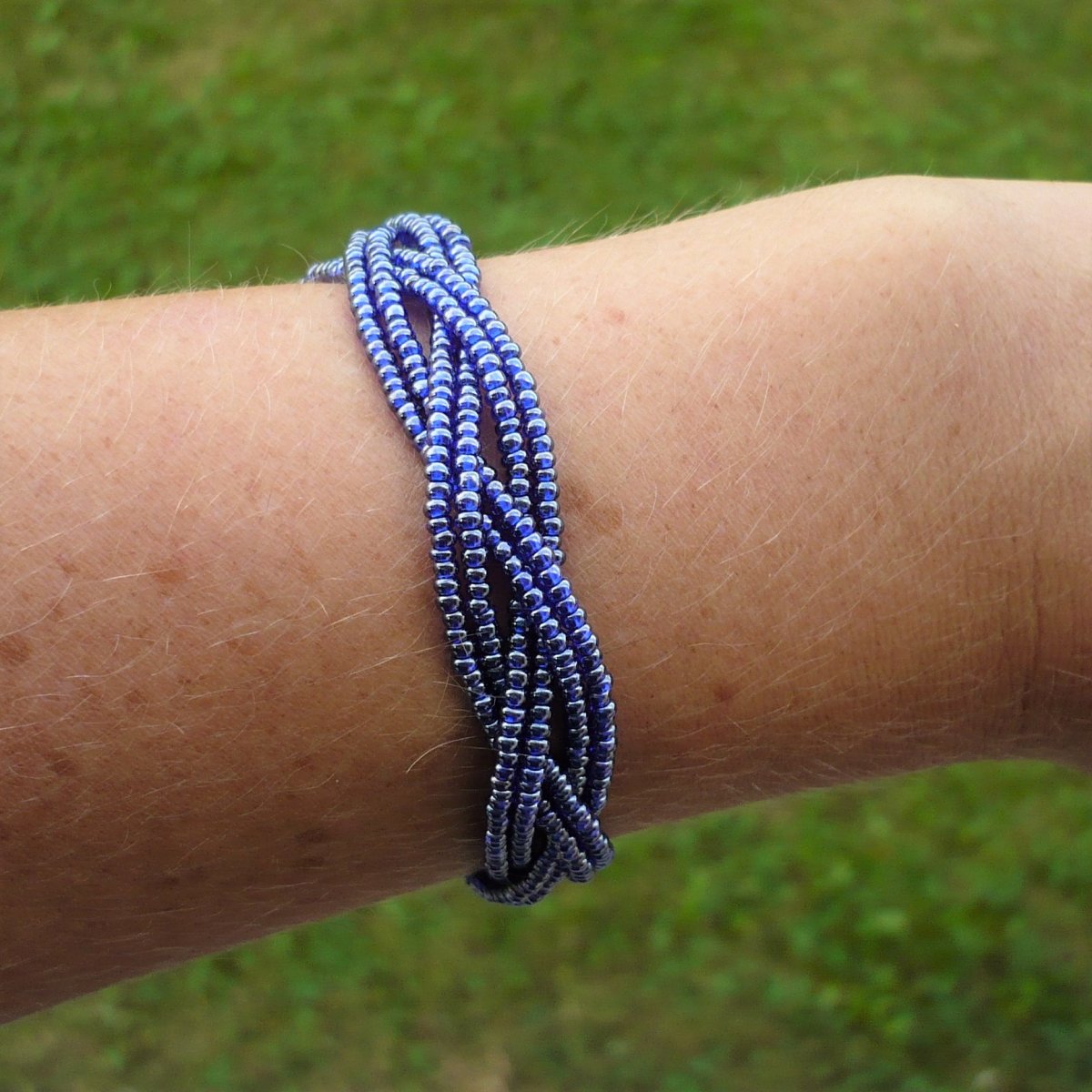 Náramek je tvořený z několika propletených řad drobných modrých skleněných korálků.