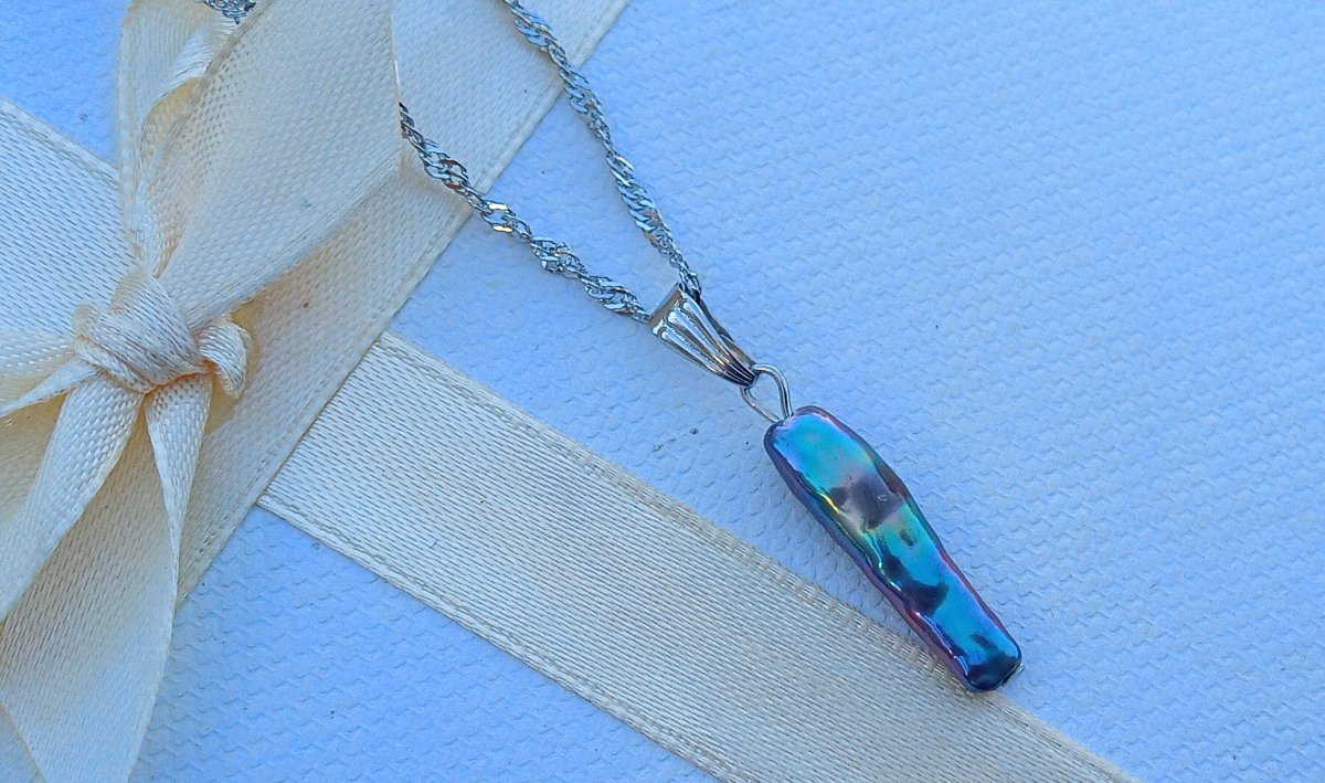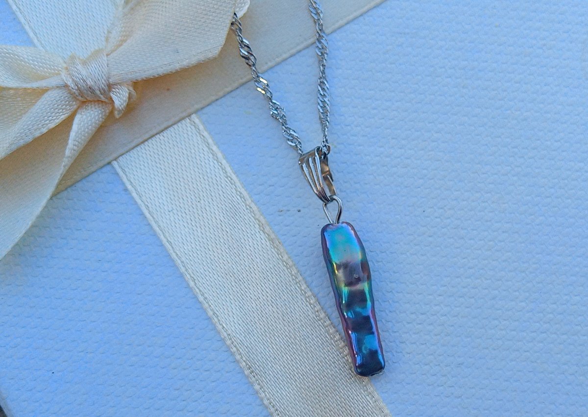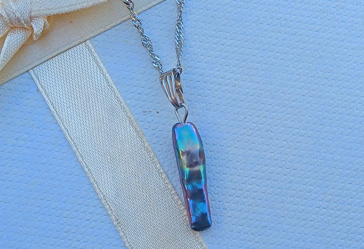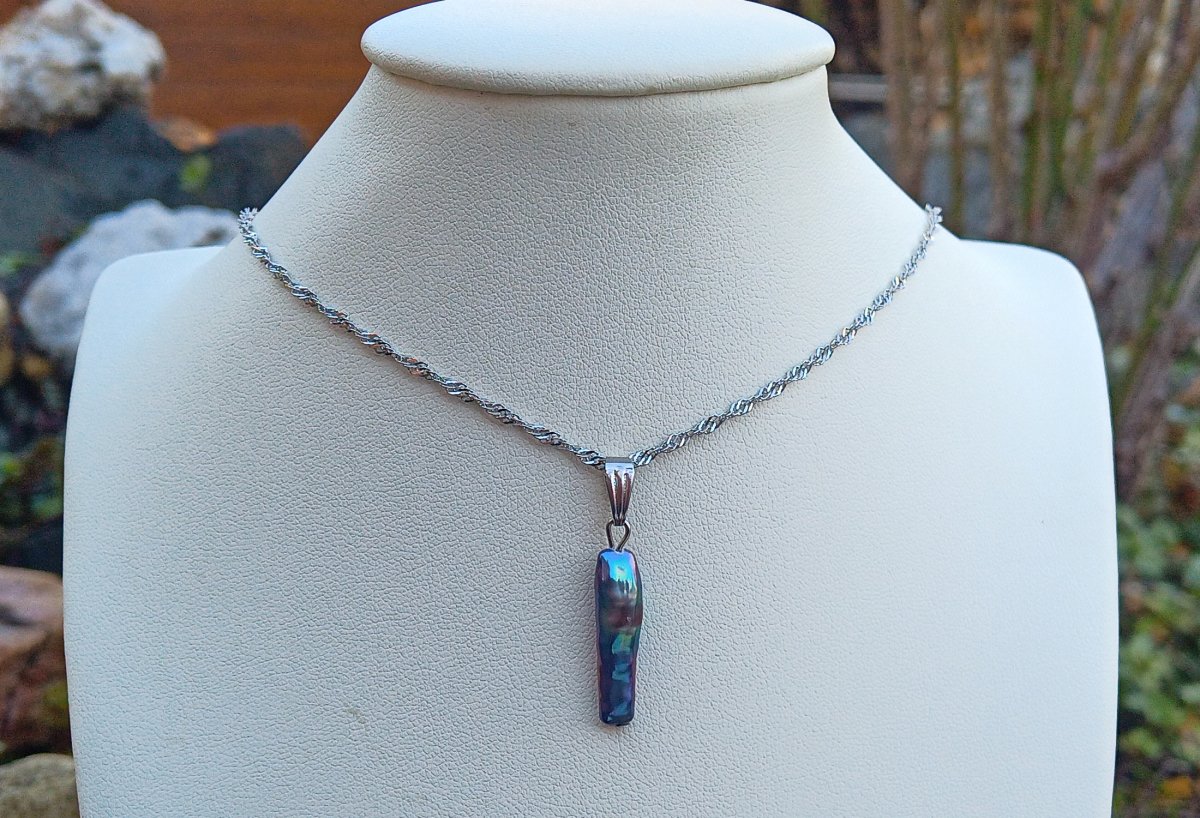 Netradiční, dlouhá, dokonale lesklá tmavá mořská keshi perla 22 mm s nádherně duhovými perleťovými odlesky elegantní přívěsek na spirálovém řetízku z chirurgické oceli - hypoalergenní = vhodné i pro alergiky. Perla je v top kvalitě!