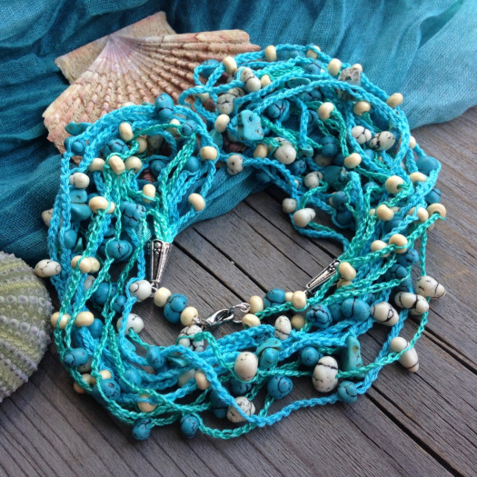 Háčkovaný náhrdelník z tyrkysové příze s vháčkovanými kousky tyrkenitu, kamínkami a dřevěnými krémovými korálky. Zakončení kaplíky a OT zapínání z tibetského stříbra.
