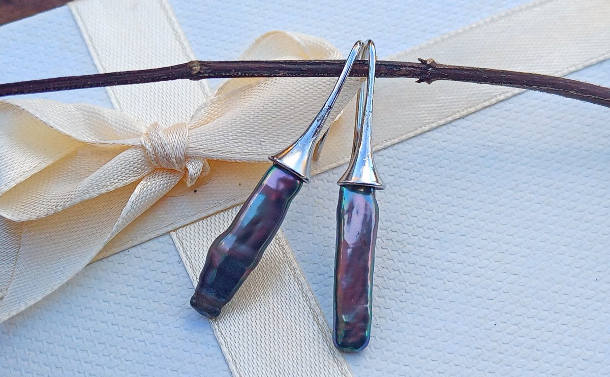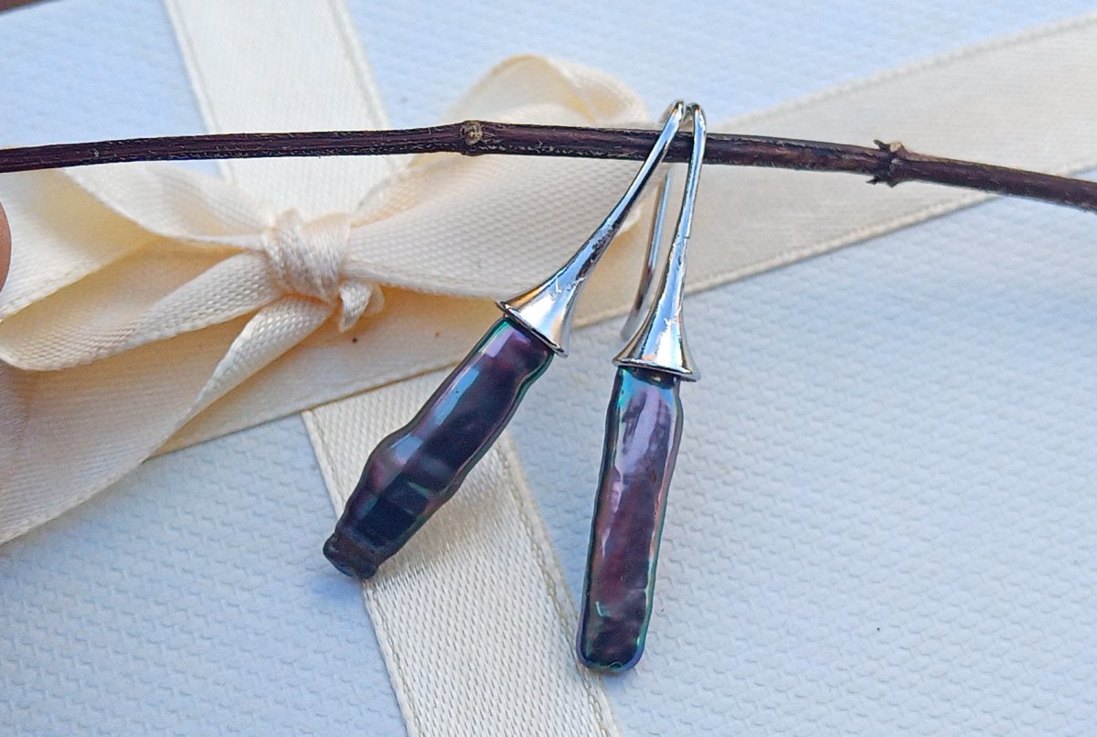 Netradiční, dlouhé, dokonale lesklé tmavé mořské keshi perly 22 mm s nádherně duhovými perleťovými odlesky na elegantních háčcích z chirurgické oceli - hypoalergenní = vhodné i pro alergiky. Perly jsou v top kvalitě!