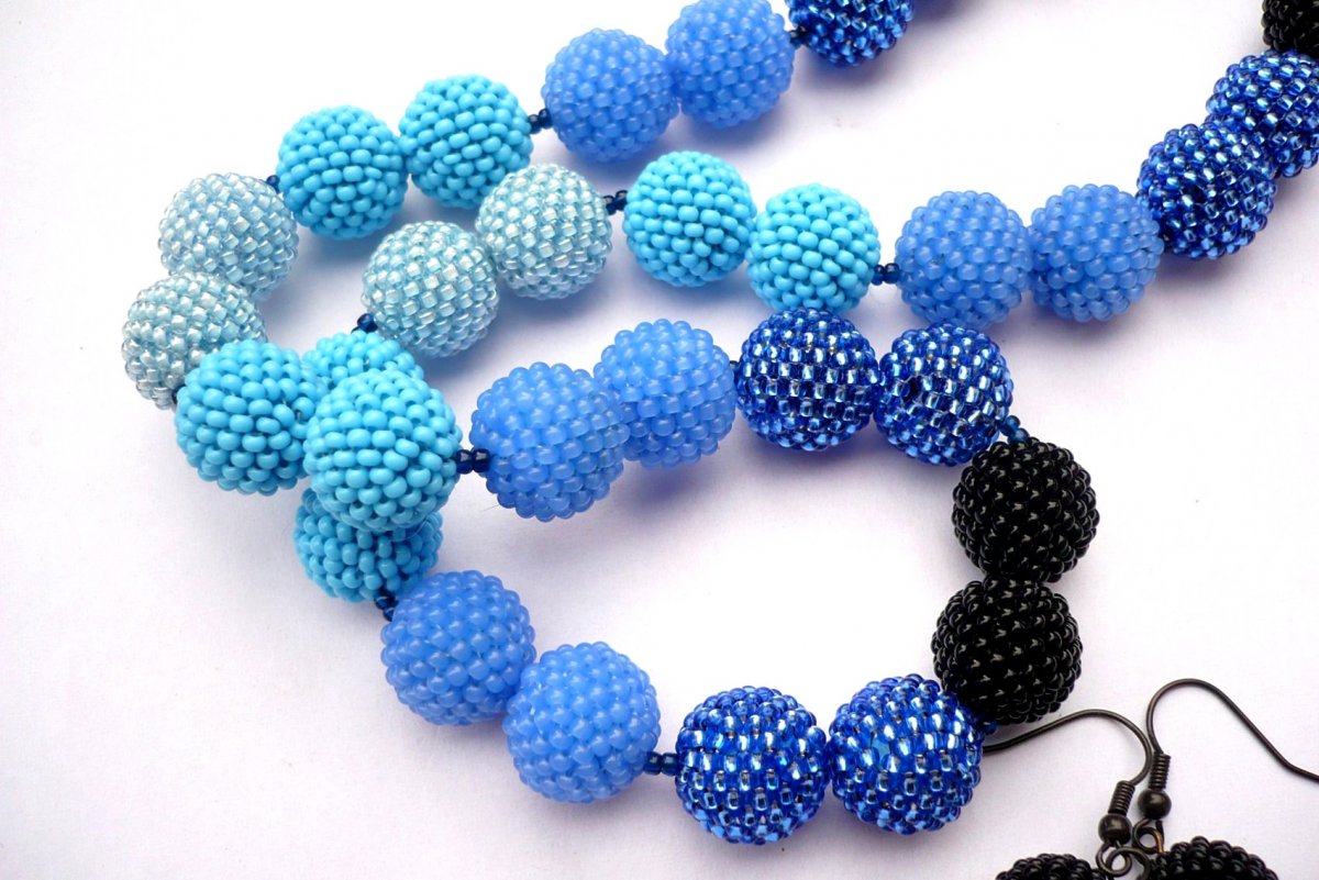 Luxusní náhrdelník z rokajlových korálků vytvořen technikou obšívání. V náhrdelníku je 34 jednotlivě obšívaných kuliček, ve kterých se skrývá dřevěný korálek. Průměr kuličky je 1,2 cm. Délka je 53 cm, je velmi příjemný na nošení a je návykový - struktura kuliček :-). Náušnice v ceně, zvolila jsem černou barvu - hodí se ke všemu! :-)