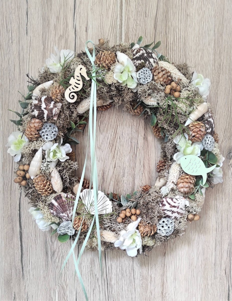 Krásný luxusní mořský věnec šedobéžový se zelenkavým nádechem na zavěšení na stěnu nebo na dveře, střední velikosti, průměr cca 30 cm. Je zhotoven z různých druhů sušených plodů, ze stabilizpvaného mechu, je ozdoben bílými látkovými květy, pravými mušlemi a dalšími přízdobami. Věnec evokuje vzpomínky na dovolenou u moře.