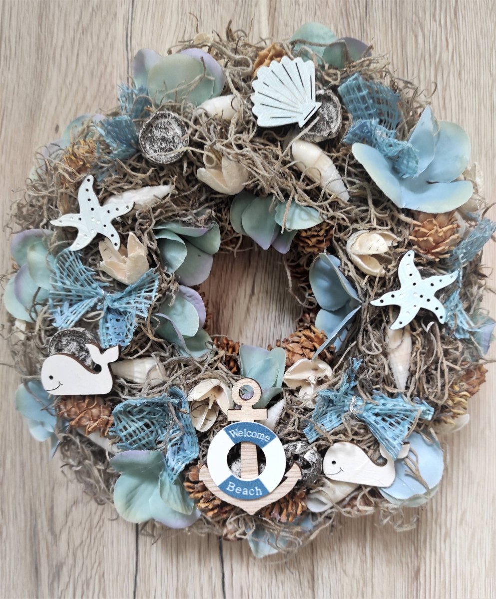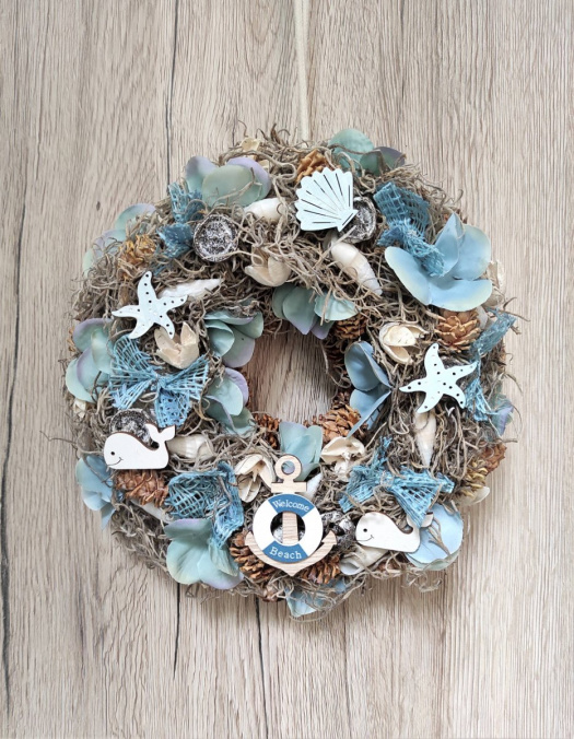 Krásný mořský věneček do světle modrobílého ladění na zavěšení na stěnu nebo na dveře, menší velikosti, průměr cca 22 cm. Je zhotoven z tilandsie, je ozdoben látkovými květy hortenzie, sušenými plody, mušlemi a přízdobami.