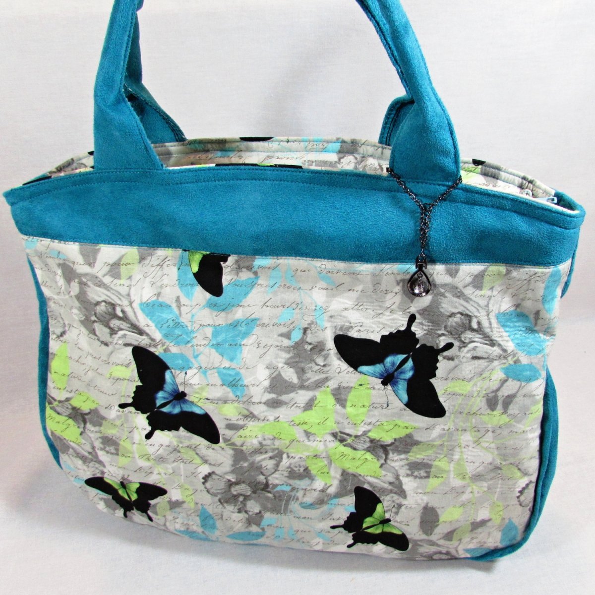 tašku jsem ušila z bavlněné zahraniční látky s motivem motýlků a doplnila příjemnou tyrkysově modrou počesanou koženko
