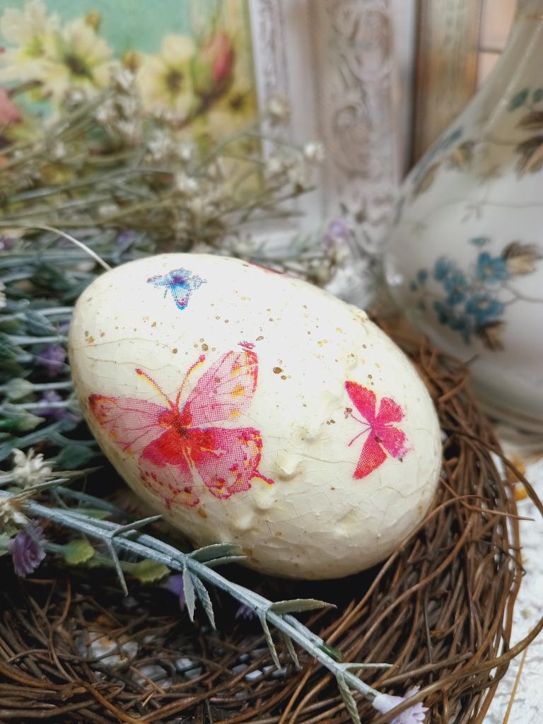 Velikonoční dekorace vajíčko s motivem motýlků v růžové a fialkové barvě. Vajíčko je a celé je krakelované a opatřené lesklým lakem. Vajíčko je tvořené jako zápich (na špejli) do dekorce, věnce, květin, květináče.
