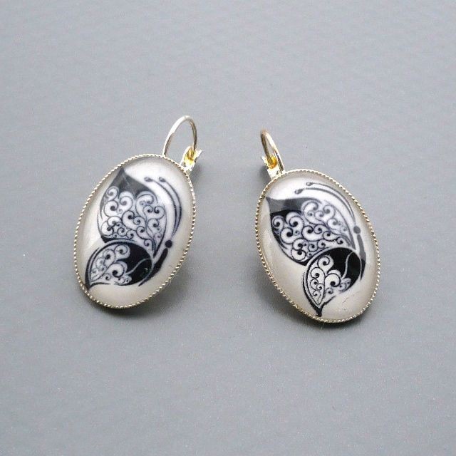 Uzavíratelné náušnice s oválným sklem s motivem černých motýlků na bílém podkladu.