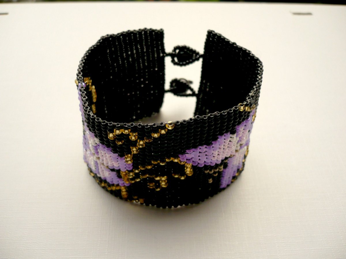 Ručně šitý náramek z rokajlových korálků. Délka náramku na ručku max. 17 cm, šířka 4,5 cm. Neobsahuje žádný kov, zapínání OT je taktéž šité z rokajlu, kulička je ze skleněného korálku. Jedná se o autorský šperk.