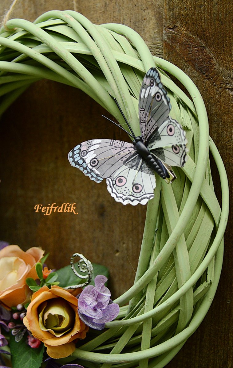 Věneček s očkem na zavěšení s umělými růžemi a eukalyptovými větvičkami a krásným propracovaným motýlkem.