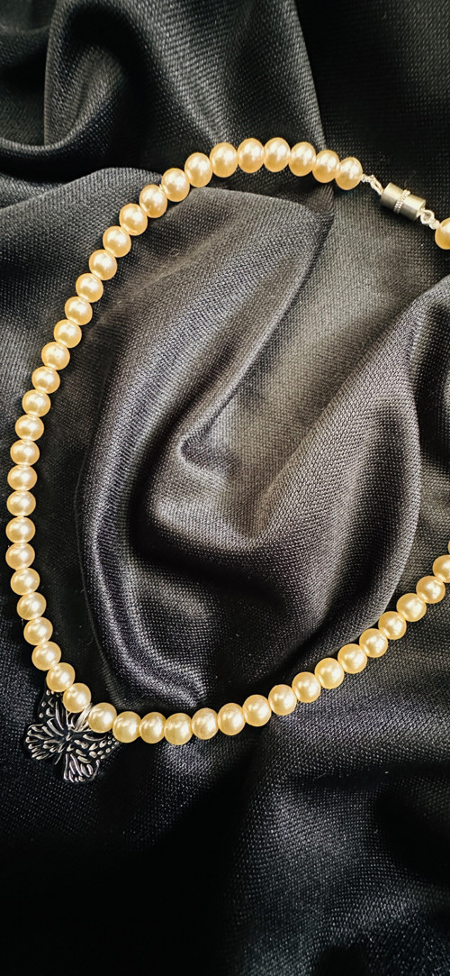 Navlečeno na vlasci, bižuterní kov, šroubovací zapínání, perličky jsou světle béžové.