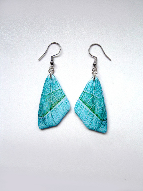 Náušnice, u kterých jsem použila mnou graficky zpracovaný motiv motýlích křídel, který je zalitý křišťálovou pryskyřicí. Jsou odolné vůči otěru - křišťálová pryskyřice je velice tvrdá a křišťálově lesklá. Motiv křídla je oboustranný a z obou stran je zalitý pryskyřicí, takže nevadí, když se na uchu otáčejí, naopak je to velice efektní.