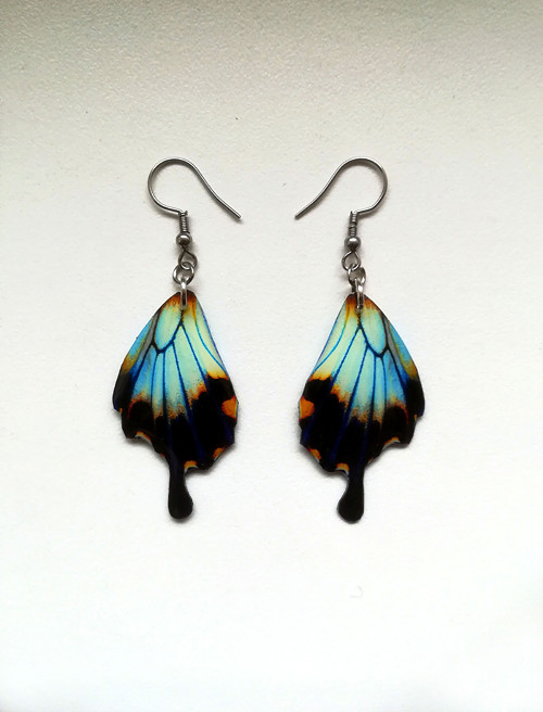 Náušnice, u kterých jsem použila mnou graficky zpracovaný motiv motýlích křídel, který je zalitý křišťálovou pryskyřicí. Jsou odolné vůči otěru - křišťálová pryskyřice je velice tvrdá a křišťálově lesklá. Motiv křídla je oboustranný a z obou stran je zalitý pryskyřicí, takže nevadí, když se na uchu otáčejí, naopak je to velice efektní.