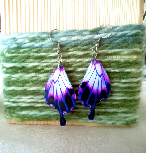 Náušnice, u kterých jsem použila mnou graficky zpracovaný motiv motýlích křídel, který je zalitý křišťálovou pryskyřicí. Jsou odolné vůči otěru - křišťálová pryskyřice je velice tvrdá a křišťálově lesklá. Motiv křídla je oboustranný a z obou stran je zalitý pryskyřicí, takže nevadí, když se na uchu otáčejí, naopak je to velice efektní.