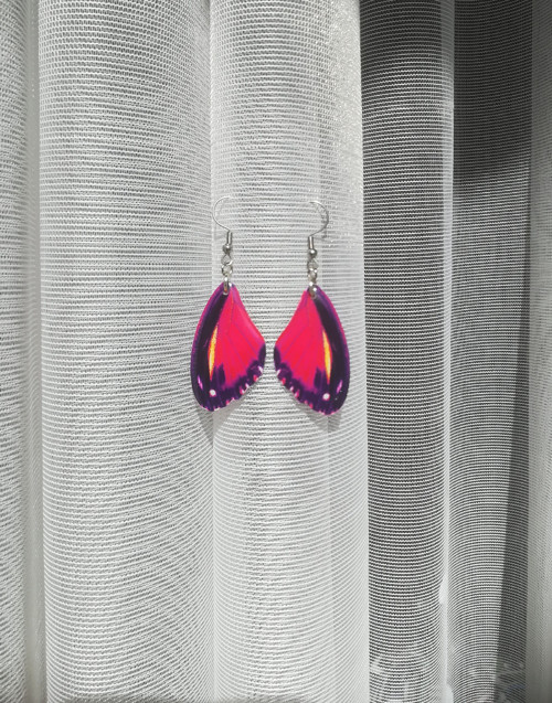 Náušnice, u kterých jsem použila mnou graficky zpracovaný motiv motýlích křídel, který je zalitý křišťálovou pryskyřicí. Jsou odolné vůči otěru - křišťálová pryskyřice je velice tvrdá a křišťálově lesklá. Motiv křídla je oboustranný a z obou stran je zalitý pryskyřicí, takže nevadí, když se na uchu otáčejí, naopak je to velice efektní.