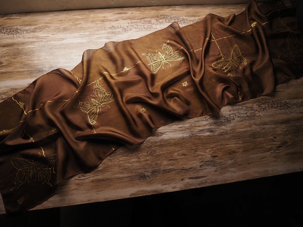 Ručně malovaný šál z přírodního hedvábí (pongé 5). Použití kvalitních barev a tepelné fixace zaručuje dlouhodobou odolnost při opakovaném praní. Snadno se žehlí. Podklad je jemně batikovaný s přidáním zlatých třpytek.