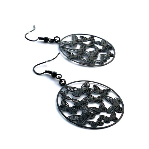 Náušnice jsou z černého, dekorativně vyřezávaného plíšku kulatého tvaru s motýlkovým motivem. Náušnice jsou lehoučké, příjemné a módní.