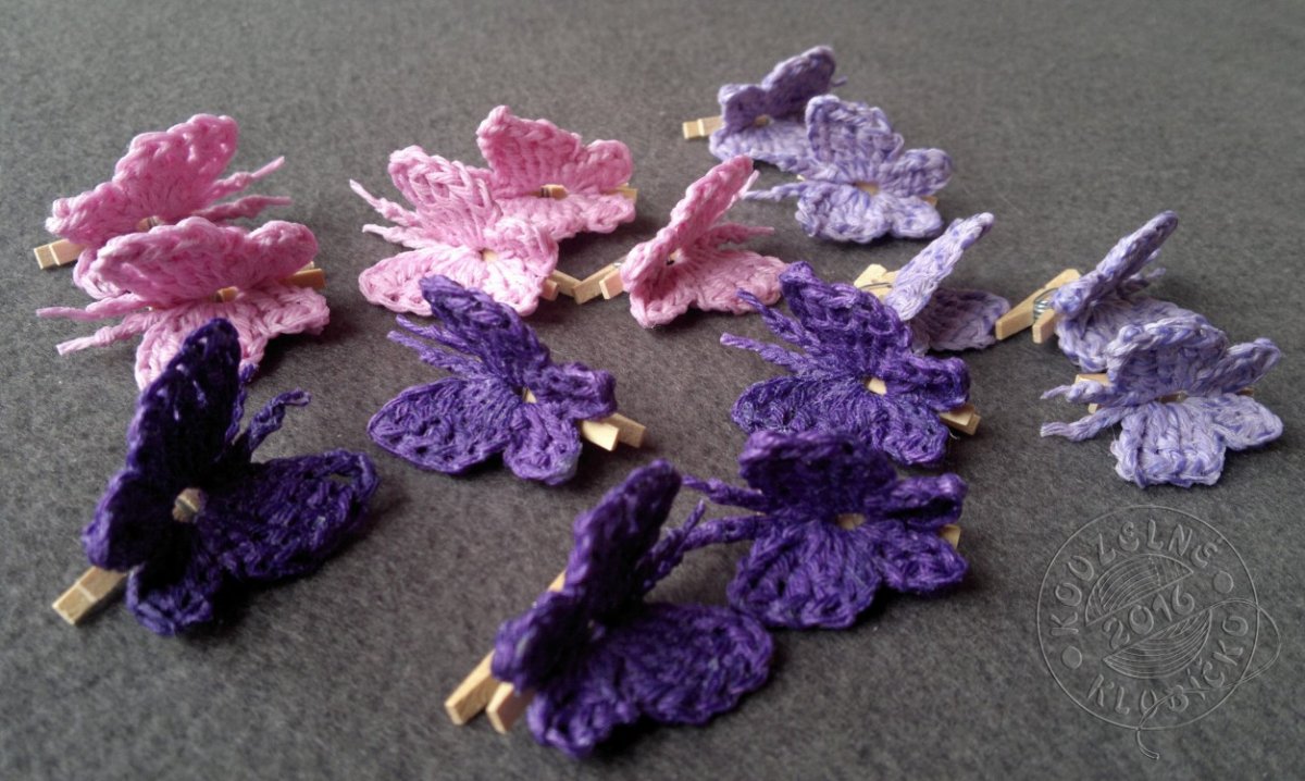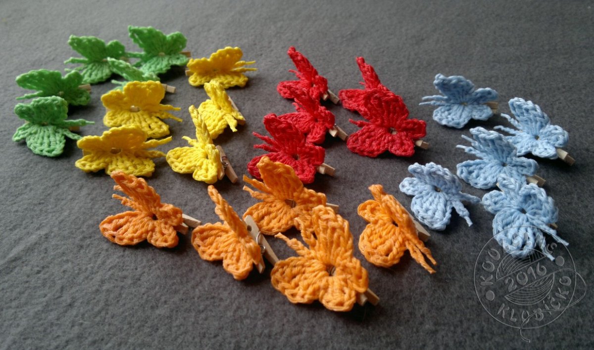 Háčkovaný motýlek z bavlněné příze, natužené škrobem a přilepené na malém dřevěném kolíčku (2,5 cm). Rozměr motýlka cca 3,5 x 3,5 cm.