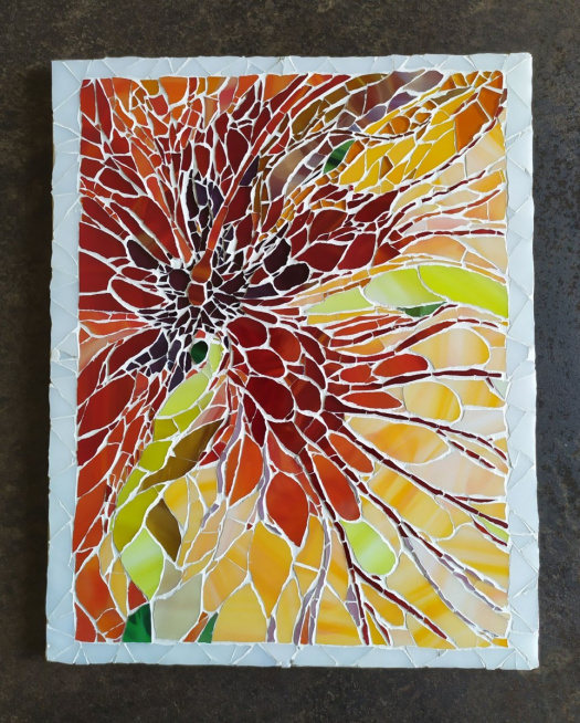Skleněná interiérová mozaika - tentokrát vyplněná spárovací hmotou a s bílým skleněným rámečkem.