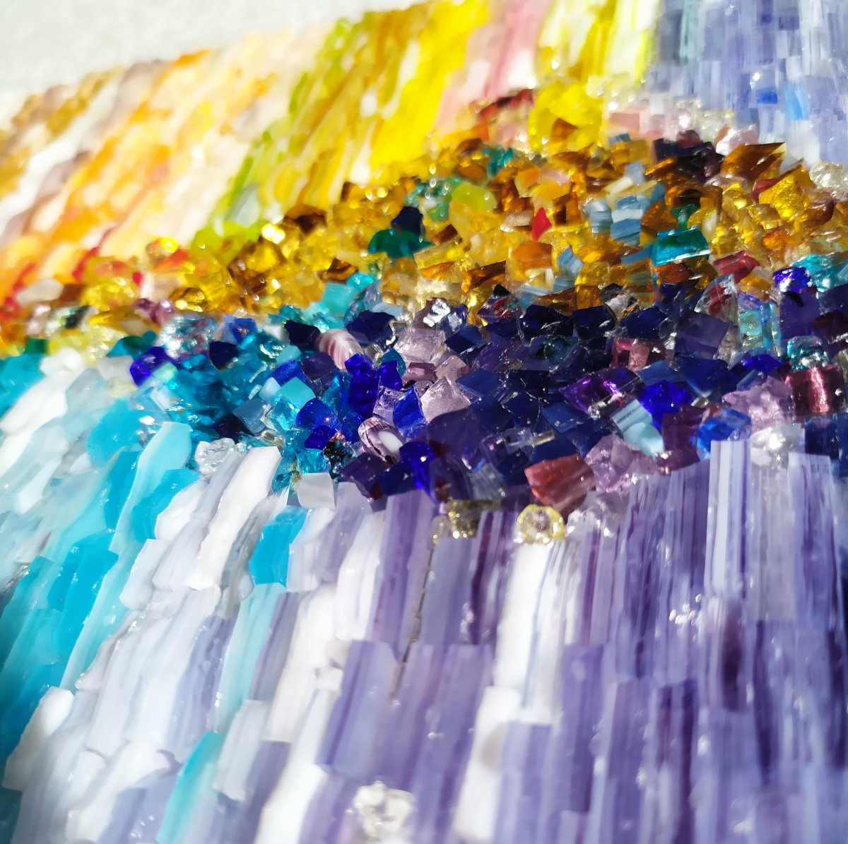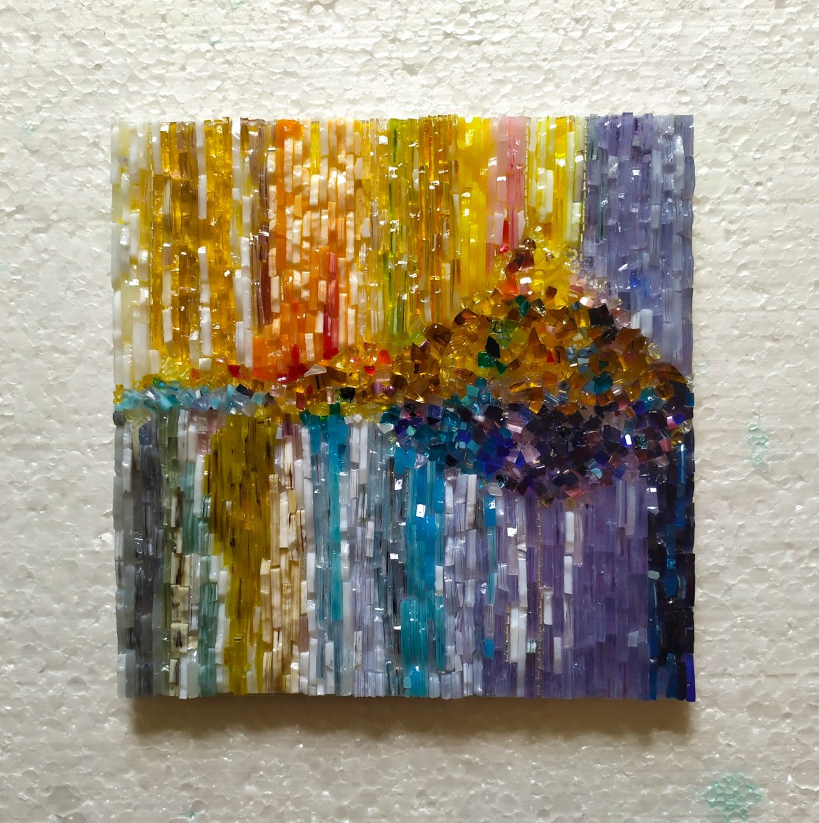 Tvořeno ze škály barevného ručně štípaného skla. Štípané kousky skla odráží světlo a pozorujeme na obrázku pěkný třpyt a odlesky.Tyto efekty jsou vidět i na fotografiích.
