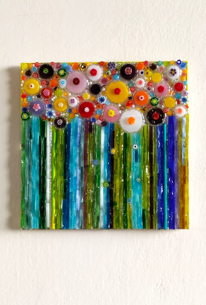 Originální typicky abstraktní skleněný obrázek. Hraje mnoha živými barvami. Je vybaven krásnými skleněnými korálkami tzv. " Millefiori - tisíc květů " . Kytičky jsou různě barevné . Každý kousek skla je vlastnoručně štípaný . Zajímavostí skleněné mozaiky je, že na slunci a denním světle dostává pokaždé trochu jiný odlesk. Záleží vždy na intenzitě světla.