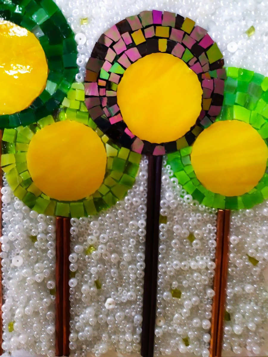 Originální abstrakt mozaika. Je vyrobena ze sytého žlutého neprůhledného opálového skla, které je válcované z různých vrstev , proto není zcela jednoznačné určit jejich odstín, barvy se prolínají a míchají, dále si všimneme mnoha odstínů zelené a asi nejzajímavější je fialové irizované sklo,které hraje " všemi " barvami. Má duhové metalické zabarvení,odstíny a barvy se mění podle úhlu pohledu a nasvícení.