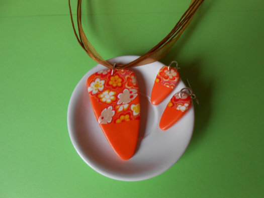 Průměr šperku 3 cm a délka 6 cm,bavlněná šnůrka hnědé barvy,délka 44 cm. Náušnice průměr 1,5 cm a délka 2,5 cm. Nalakováno.