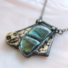Náhrdelník starobylého vzhledu je vyroben z dvou krásných kousků labradoritu s nádhernými barevnými odlesky, ze tří mnou modelovaných keramických střepů, z mědi a cínu technikou cínování - tiffany. Celý přívěsek má rozměr 5,4 x 5cm a je zavěšen na 43cm dlouhém šedočerném řetízku s karabinkou. Oba kameny mají drobné přírodní prasklinky - nejedná se o poškození nebo vadu kamene. Mimo řetízku a karabinky je vše ruční práce a jedná se o autorský šperk. Patinováno, ošetřeno antioxidantem.