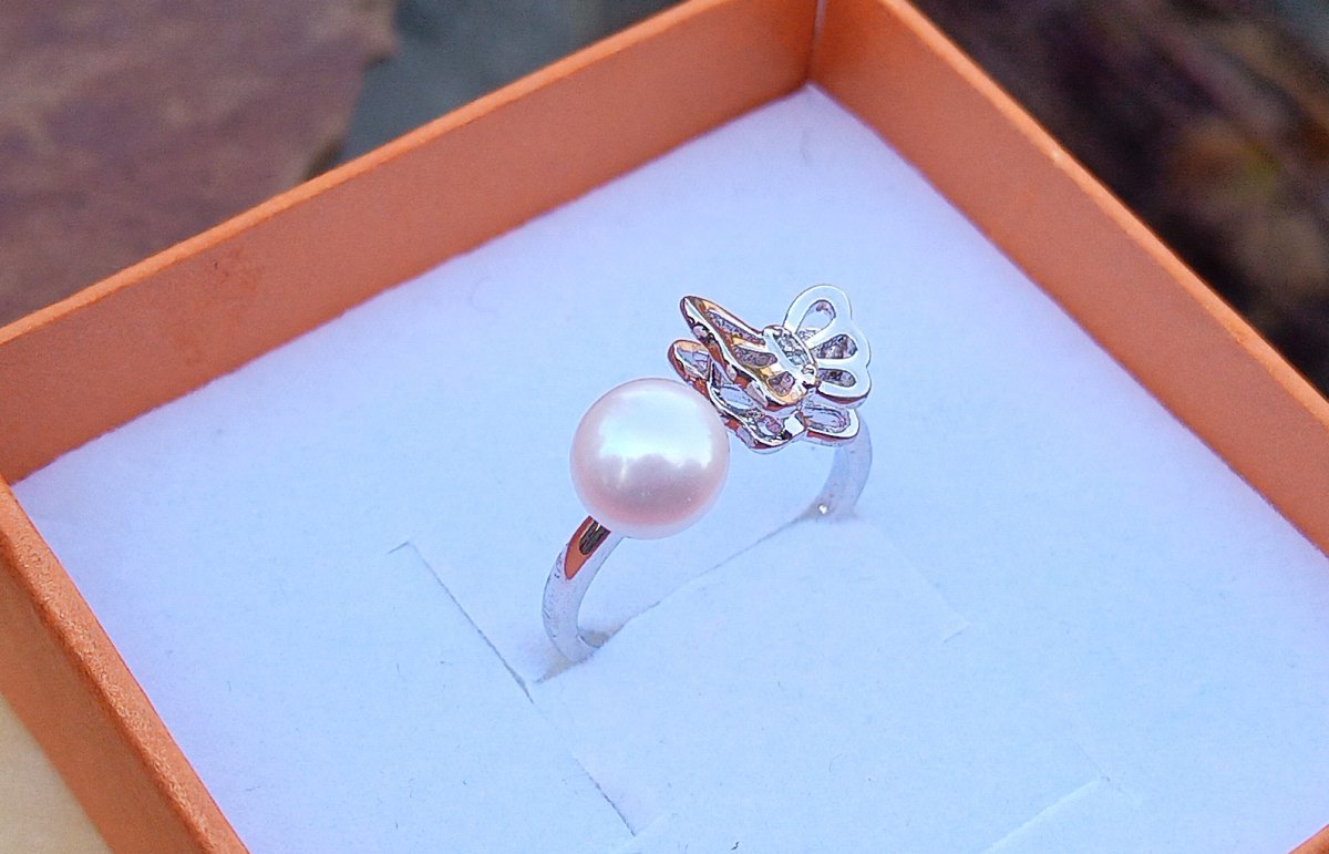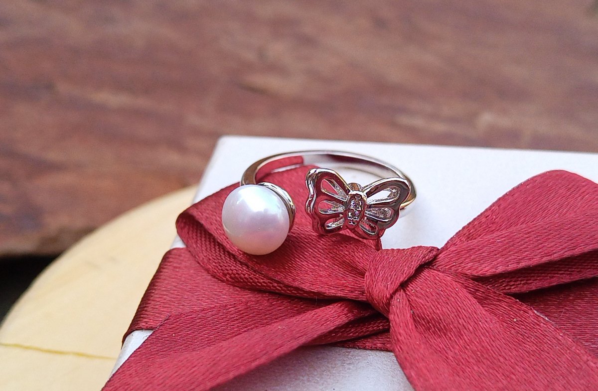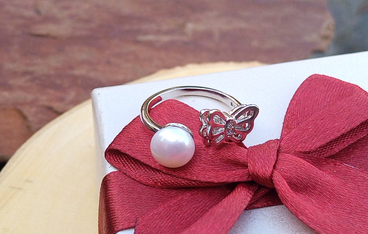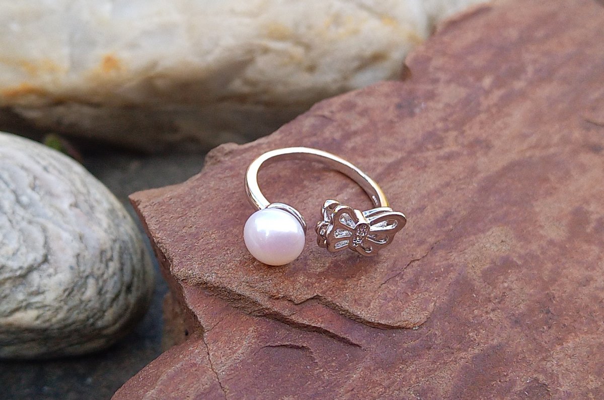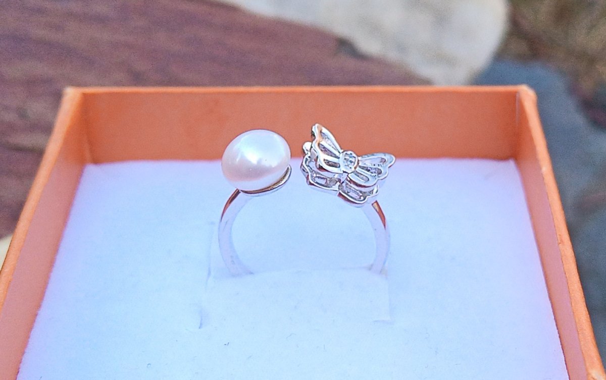 Bílá dokonale lesklá říční perla typu button v AAA kvalitě o průměru 7 mm v prstýnku zdobeném motýlkem s dvojitými křídly. Prstýnek je v univerzální velikosti.
