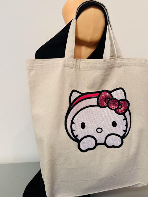 plátěná silnější taška s nášivkou, délka od ramene 55 cm, šíře 40 cm, délka 38 cm.