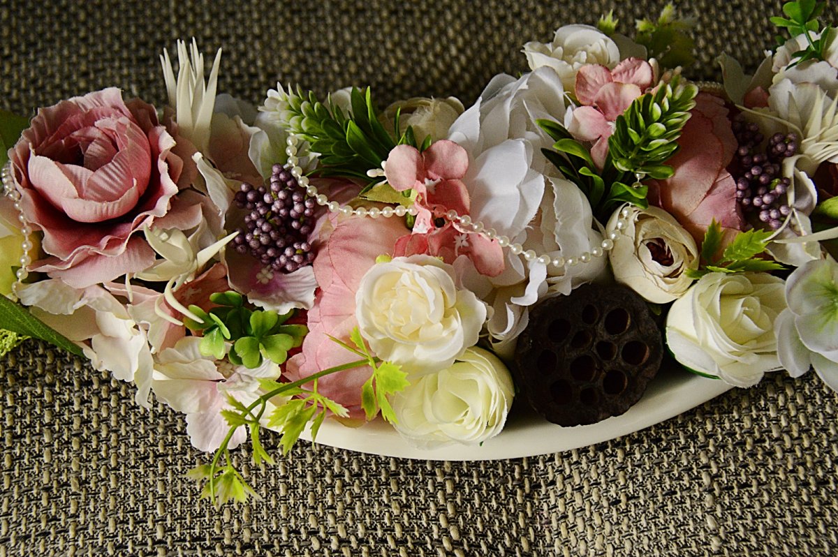 Bohaté aranžmá na porcelánovém bílém tácu s látkovými a umělými květinami (hortenzie, pivoňky, ranunculusy...), zelení a perličkami.