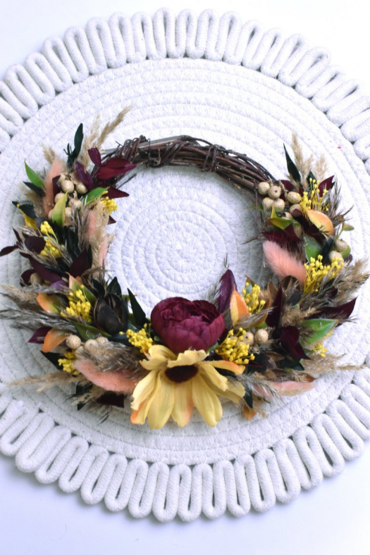 Věnec má základ spletený z březových proutků a ozdoba je vyrobena ze sušených trav, umělých lístečků, látkových kvítků, bobulek a sušených plodů. Působí velmi přírodně a přitom je trvanlivý - vydrží mnoho sezón.