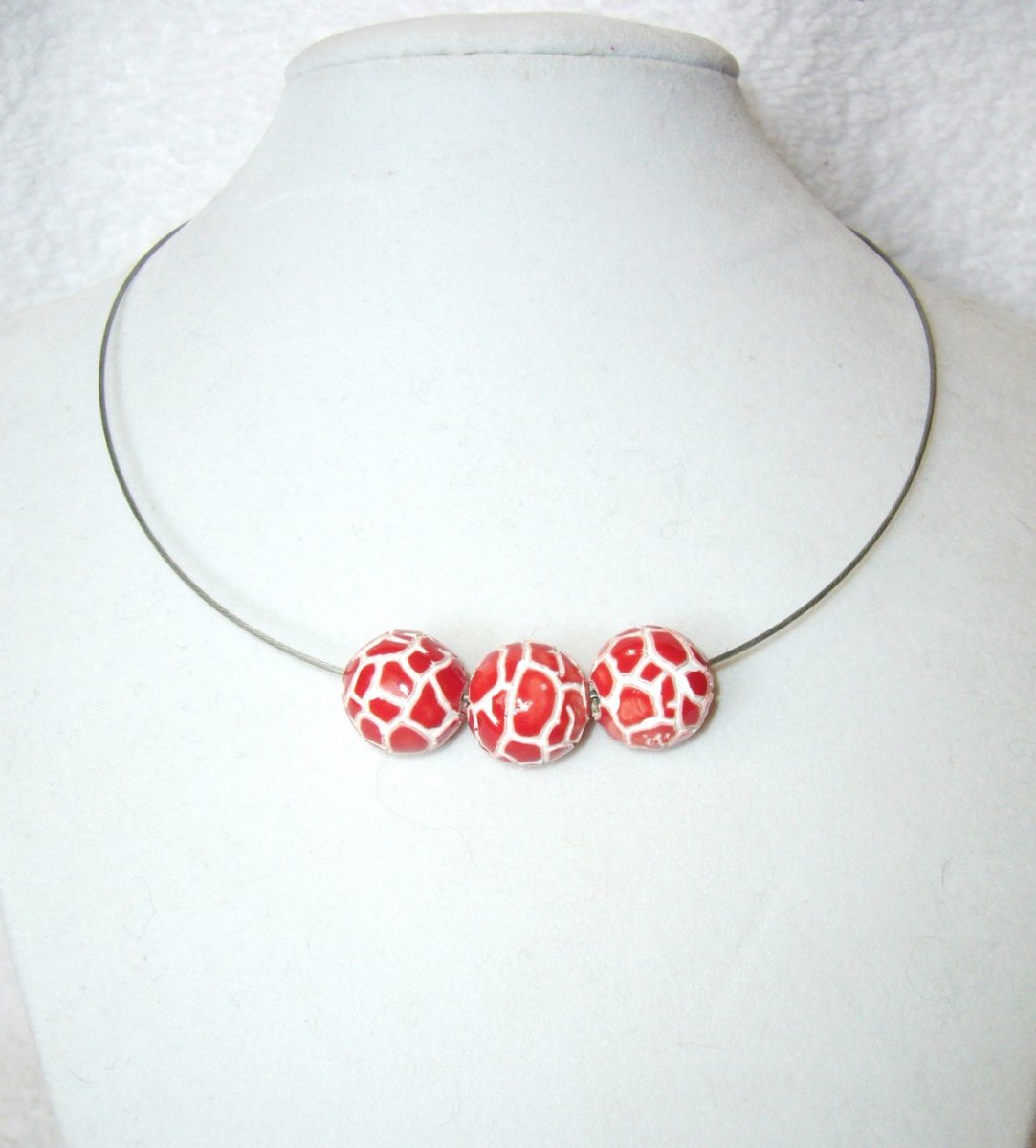 Červeno bíle korálky na stříbrné obruči.