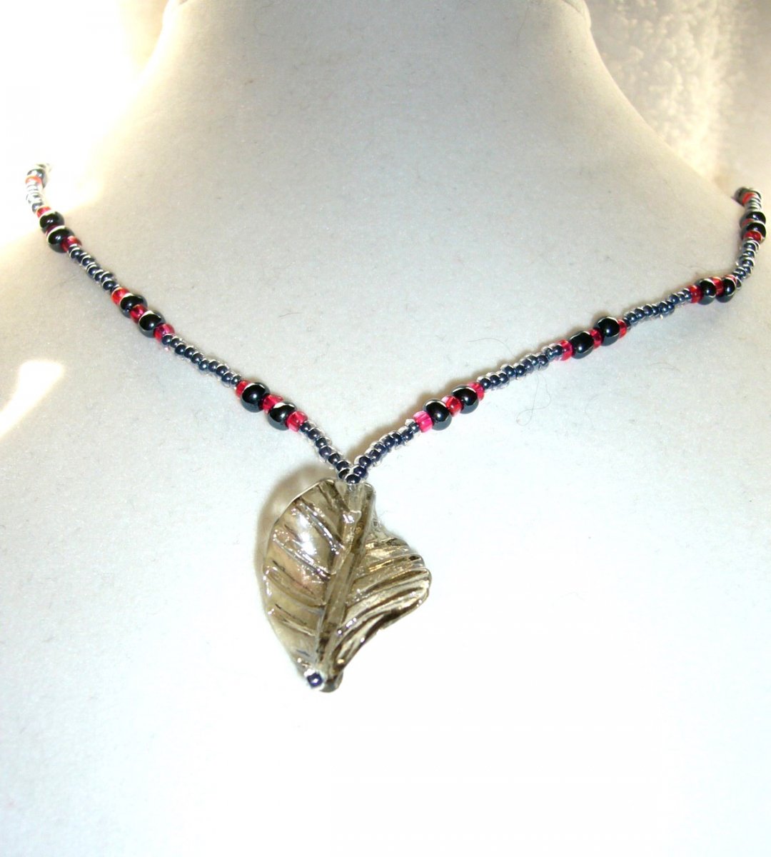 Obvod náhrdelníku cca 49 cm, zapínání karabinka.Ozdoba skleněný list v kouřové barvě, náhrdelník je doplněn korálky kouřové barvy + růžové korálky (sytější barvy) k zvýraznění.