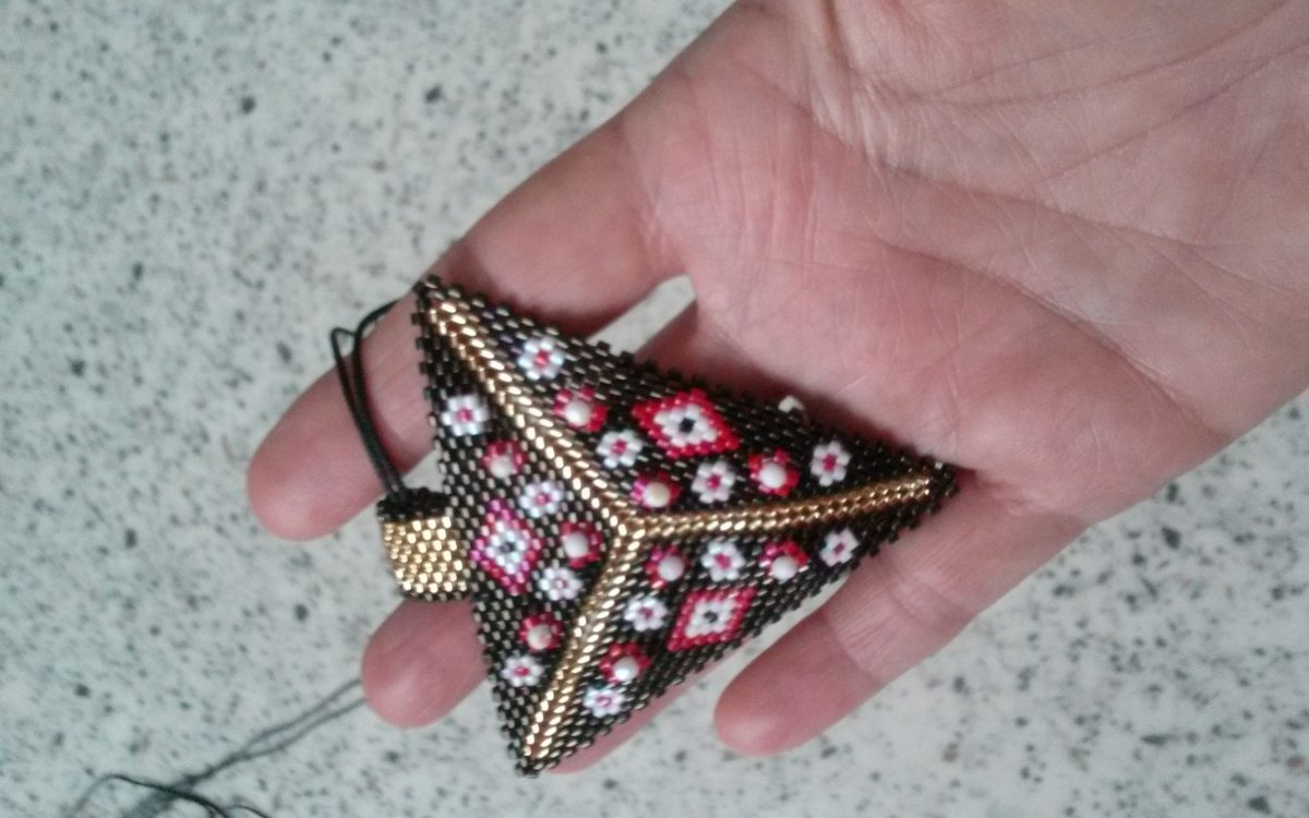 Šitý náhrdelník z Toho korálků velikosti 10/0 zavěšený na lanku.