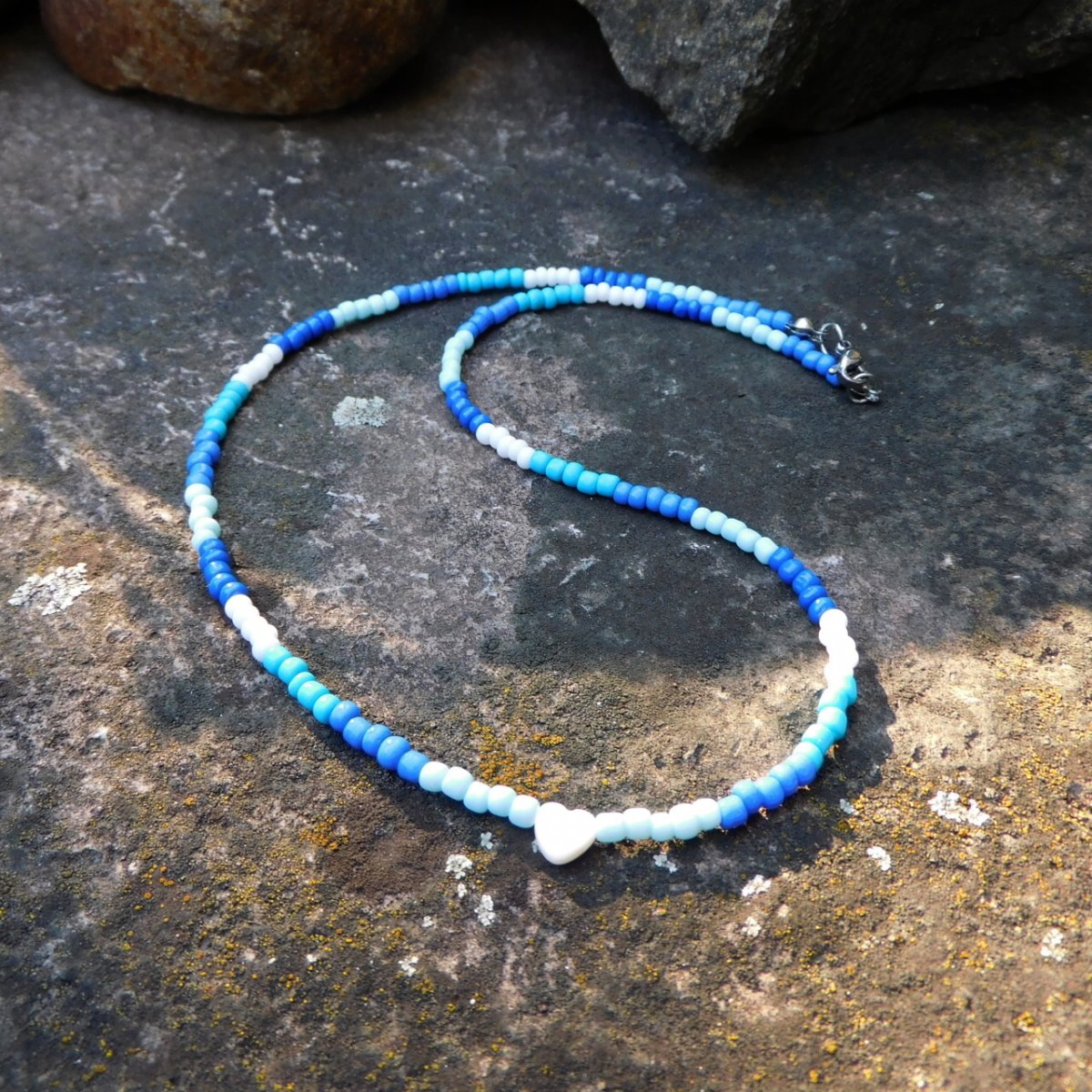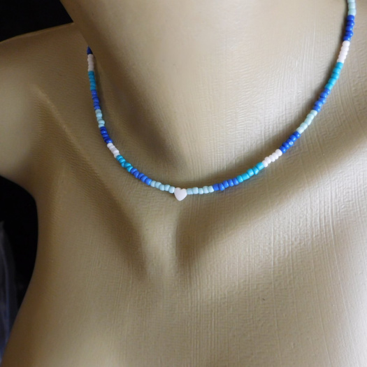 Náhrdelník je vyrobený z malinkých barevných skleněných korálků- preciosa, rokajl a malinkého perletového srdíčka