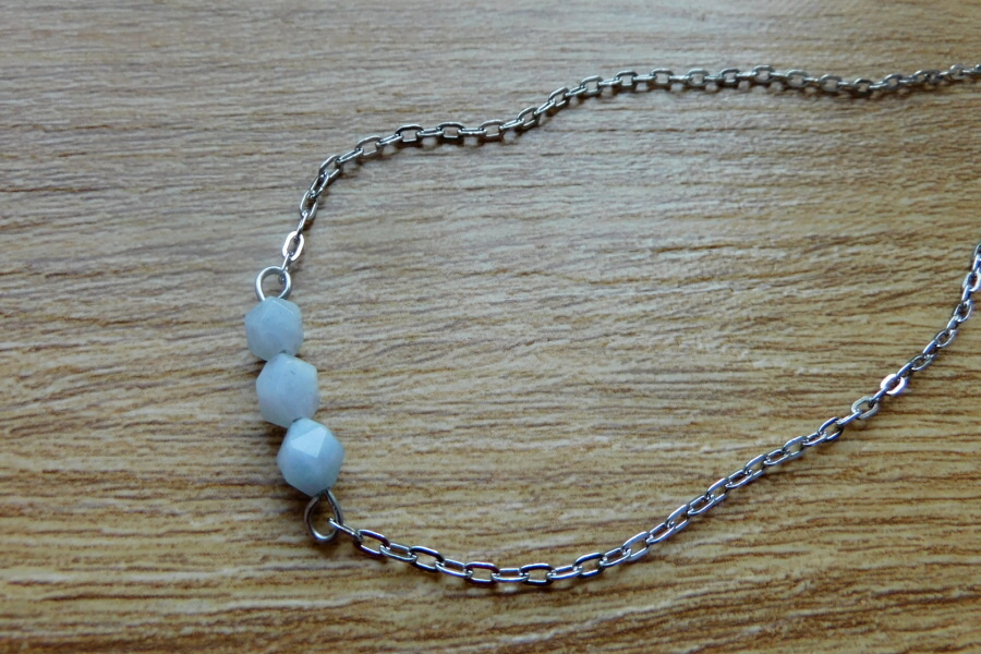 Jednoduchý jemný nerezový řetízek s kuličky jemně modrého akvamarínu.