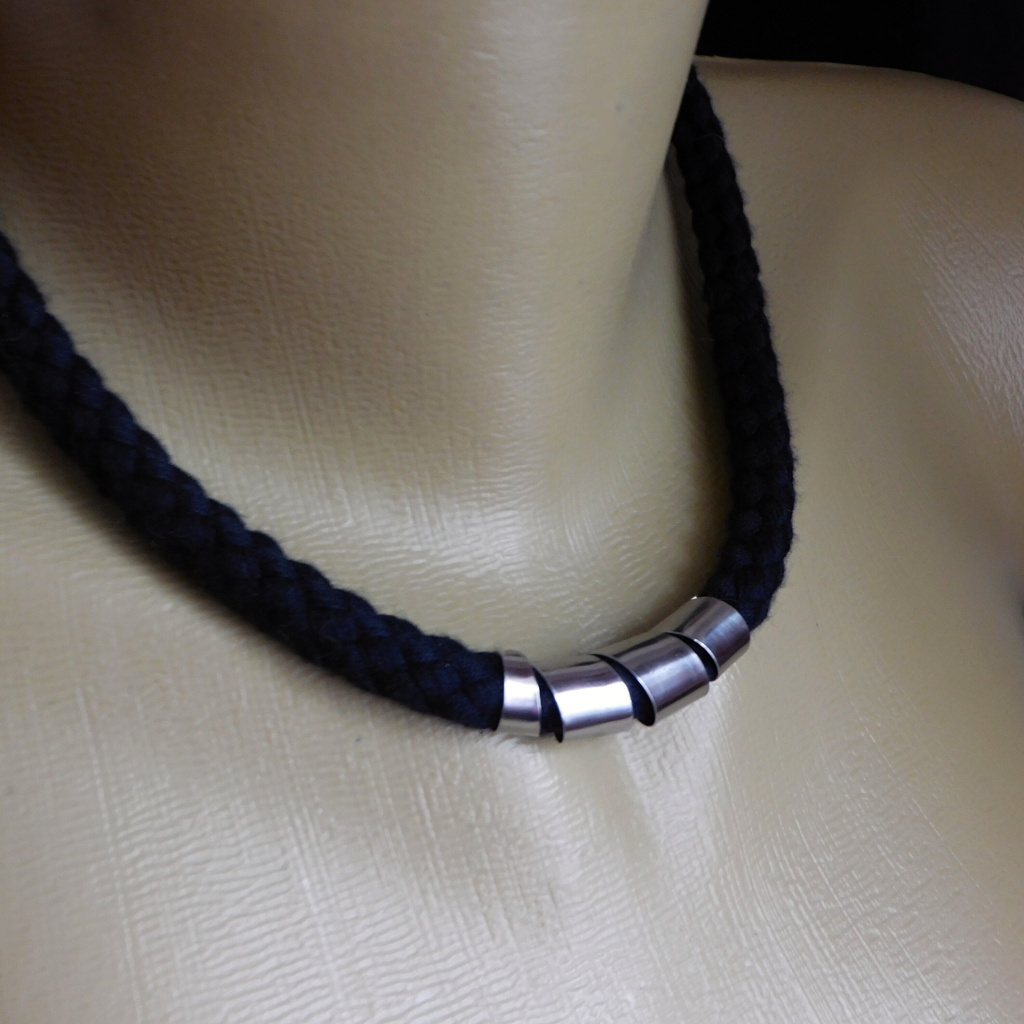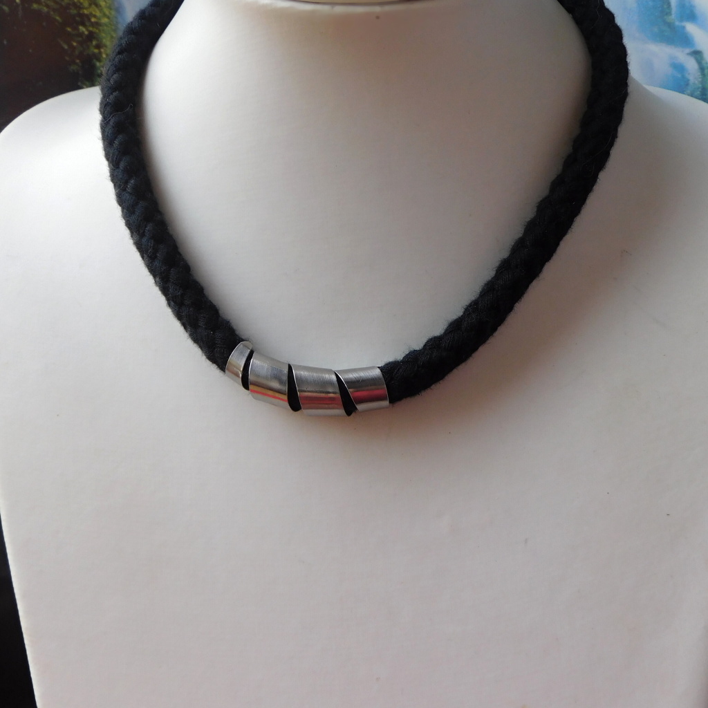 Lanový náhrdelník z černého lana a ozdobné ručně vyrobené, leštěné trubičky.